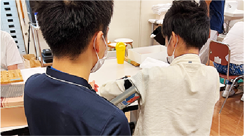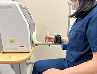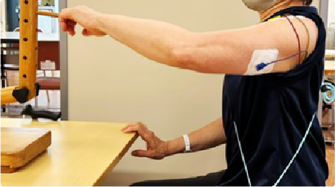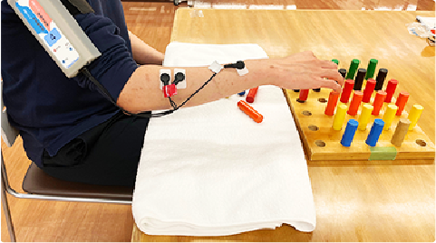 肩の機能向上は、手の麻痺の治療において重要と言われています。肩周りの筋肉に電気刺激装置(IVES)を装着し、前方へのリーチ動作(腕を前や上に伸ばす動作)をサポートしながら作業療法や日常生活動作を訓練します。より安定して麻痺した手を使えるようになるための土台作りを目指します。